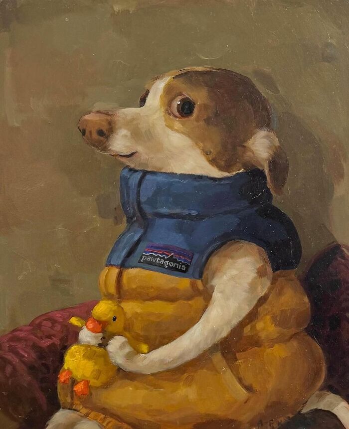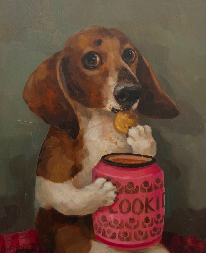 This love led people to domesticate animals into pets. And as of 2024, 66% of U.S. households have at least one pet, which suggests that pets are very common nowadays. Their popularity didn’t happen for no reason. Pets are beneficial to humans. They not only serve as companions people form emotional attachments with, but they can also improve the physical and mental health of their owners. Not to mention, pets can help children develop a positive self-image, make them more responsible and sensible, and even help them build better relationships in the long run. In fact, animals appear in art so frequently that art experts have distinguished certain meanings that each animal represents. For instance, dogs are believed to portray loyalty and devotion, as well as nobility or masculinity. On the other hand, cats portray seduction, sensuality, and, sometimes, even female promiscuity. Basically, the majority of animals, even, for example, butterflies or donkeys, that appear in art can be prescribed some kind of meaning. One of the artists whose art is fueled by various pets is a British realist with a modernist vision, Alison Friend. She’s the first female stonemason of the City of Nottingham, an accomplished children’s illustrator of over 20 published books, and a painter. Today, we’re focusing on her paintings of cute and funny animals, which are beloved by people all around the internet. Her dad was also a big animal lover, and he used to paint birds and horses, which, naturally, inspired the woman: “I used to sit and watch him paint when I was tiny. I wanted to be him, really, so I’d copy animals out of these amazing books.” As we can see, Alison was successful in realizing her childhood dream, and now, she’s a famous painter that people on the internet go crazy for. Currently, she has over 800k followers on Instagram, where she shares her creations. But this social media site isn’t the only place where they can be found – there’s also her website, where people can not only look at the drawings but purchase prints of them as well. And well, let’s admit, these paintings of dogs (as well as other creatures) are very lovely and amusing. Who would’ve thought that we needed a painting of a cat eating Cheetos or a dog enjoying a cup of coffee in our lives? Well, Alison did, and she delivered them perfectly. Which of these paintings did you like the best? Share with us in the comments. And don’t forget to give it an upvote! Follow Bored Panda on Google News! Follow us on Flipboard.com/@boredpanda! Please use high-res photos without watermarks Ooops! Your image is too large, maximum file size is 8 MB.