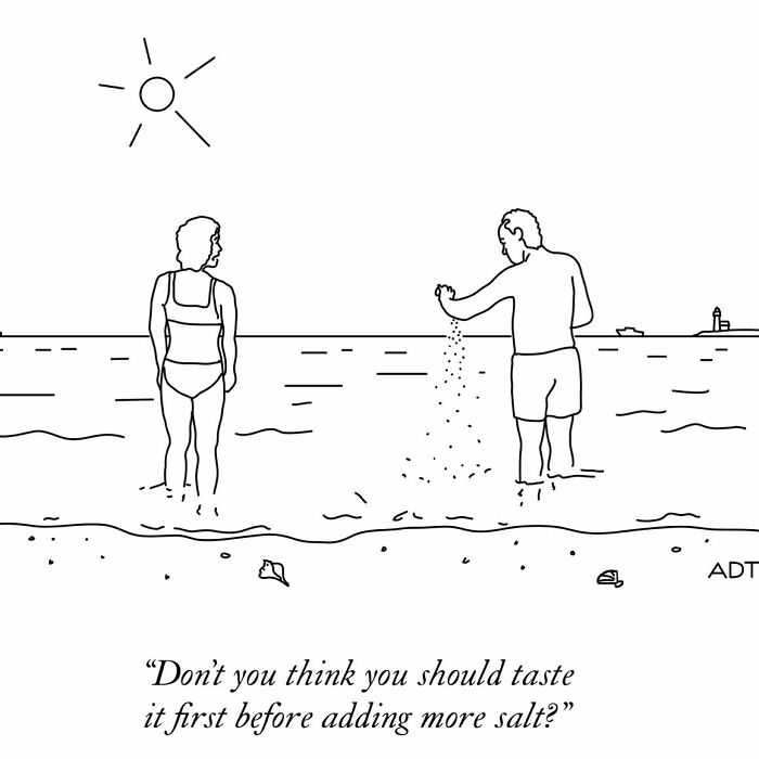 Thompson has become a familiar name as a cartoonist for The New Yorker, where his humor has graced the pages for many years. Beyond the magazine, his artwork has also found a home in various art galleries, showcasing his creative mastery. Scroll down for some giggles and smiles! More info: Instagram | adamdouglasthompson.com | twitter.com Another challenge is income. “There are very few ways to make money from the sort of visual gag cartoons that I do - The New Yorker is one of the few places that buys them these days. I also teach and do other art and design work to support my cartooning habit.” Follow Bored Panda on Google News! Follow us on Flipboard.com/@boredpanda! Please use high-res photos without watermarks Ooops! Your image is too large, maximum file size is 8 MB.