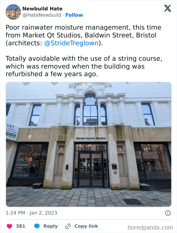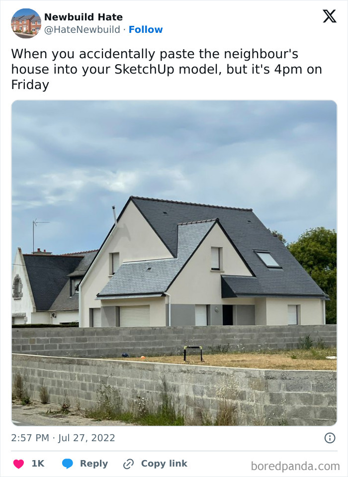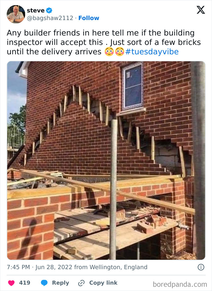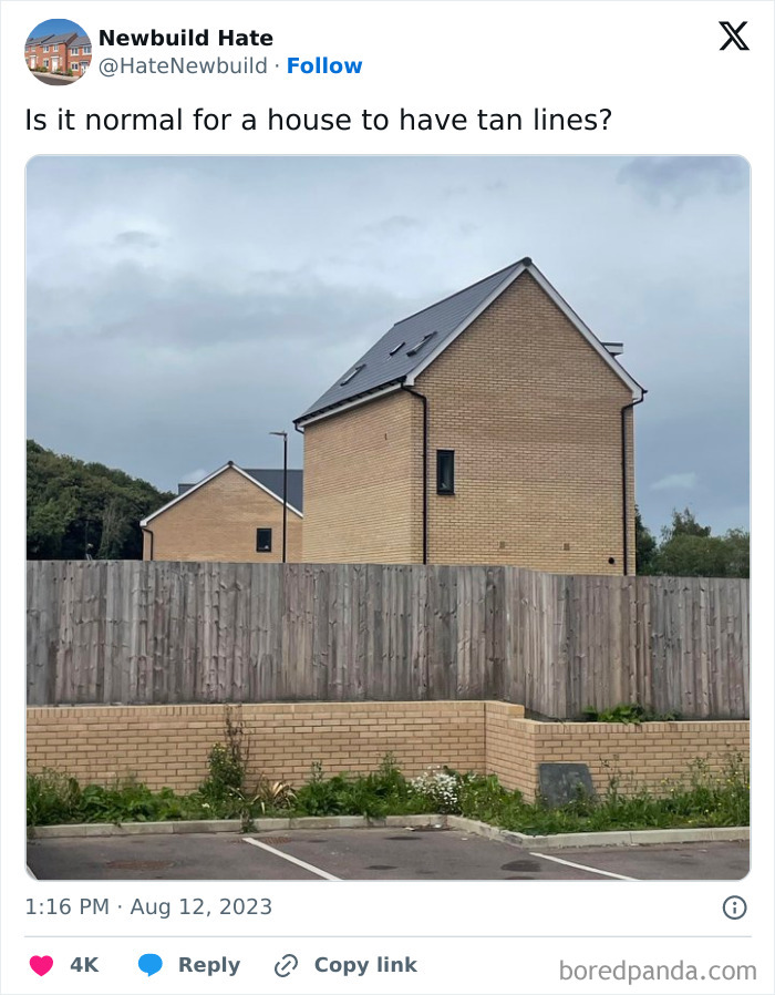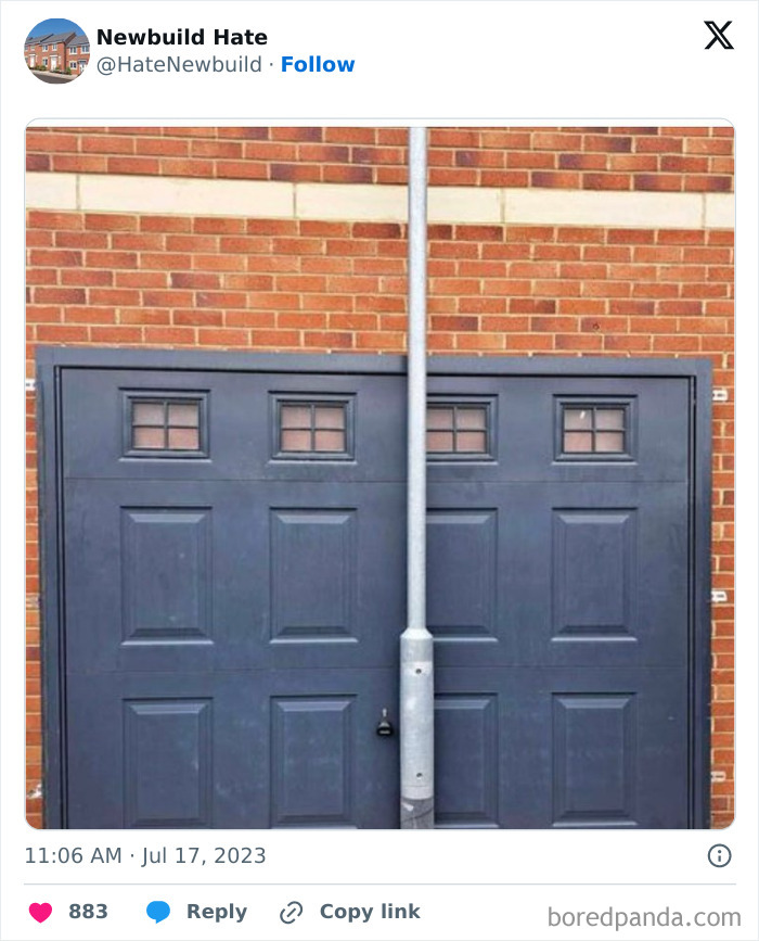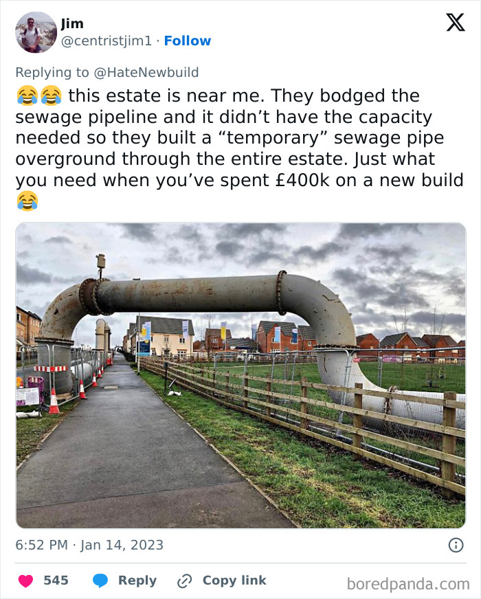Some of these homes are so bad that they’ve caught the attention of people online, with many ending up on the popular X page ‘Newbuild Hate’. From hilariously small balconies to crumbling foundations, this account exposes unbelievable construction mishaps. We’ve put together some of their most shocking posts—check them out below! The page appeared on X in 2021, and since then, it has grown to over 127K followers, becoming a space for people to share their frustrations about modern housing. In the comments, users often cope with humor. “Built to last… about 11 years,” someone jokes about an apartment block with moldy walls. “Fewer points of entry to defend from home invasion,” says another user about a house with barely any windows. John Cooper, a snagging inspector and managing director of New Home Quality Control, thinks the situation is even worse than the survey suggests. He shared that his team speaks to 350 customers a month, and “everyone is not happy.” “I woke up one morning and decided I couldn’t live with myself,” he says. “I had been a site manager on a housing job in Pembrokeshire and my boss told me to hide a serious roof problem from a customer. I knew it would cause leaks further down the line, but he insisted we cover it up.” Four days later, Cooper quit. “I decided I had to make a change in the industry,” he says. “We need to highlight the dreadful things that are happening and begin to change builders’ mindsets. There’s just no pride in the job any more. ” “The shareholder is the real customer,” says Brian Berry, chief executive of the Federation of Master Builders. “In the current climate, there’s less room to make this gross amount of money, so they have to cut costs wherever they can, like using inferior adhesive to glue tiles on, or hiring cheaper workers.” The CIOB suggests to check if the housebuilder you’re interested in is registered with an organization that oversees quality control. For example, in England, most developers are registered with the New Homes Quality Board. If they’re not, reach out to them to ask if they follow any specific codes or standards. And remember to hire a reputable home inspection company to check for underlying issues. Don’t forget to examine the plumbing, roof, and windows. Window frames can be a great indicator of the house’s overall condition. “If people have invested in and looked after those, they are likely to have taken great care of the rest.” The key is to be vigilant and pay attention to details. Follow Bored Panda on Google News! Follow us on Flipboard.com/@boredpanda! Please use high-res photos without watermarks Ooops! Your image is too large, maximum file size is 8 MB.
