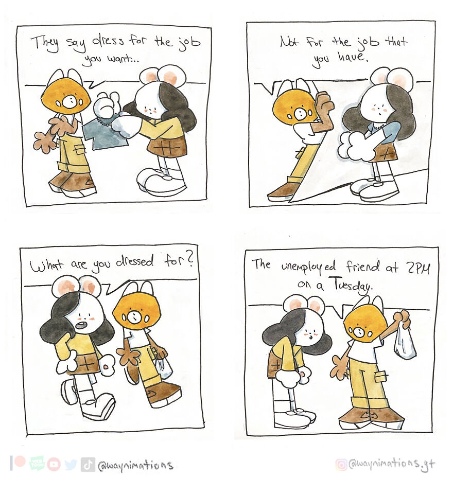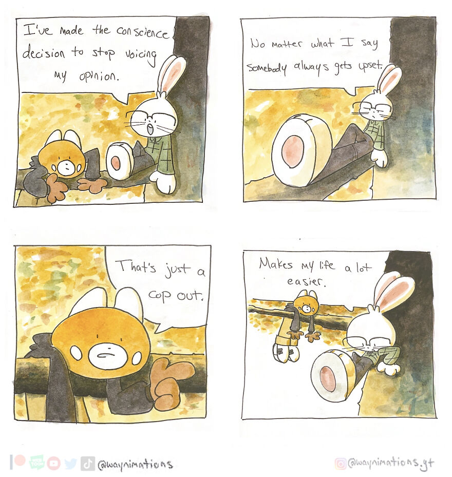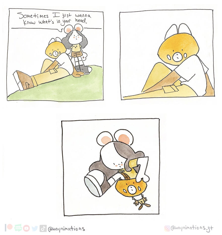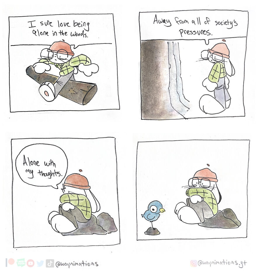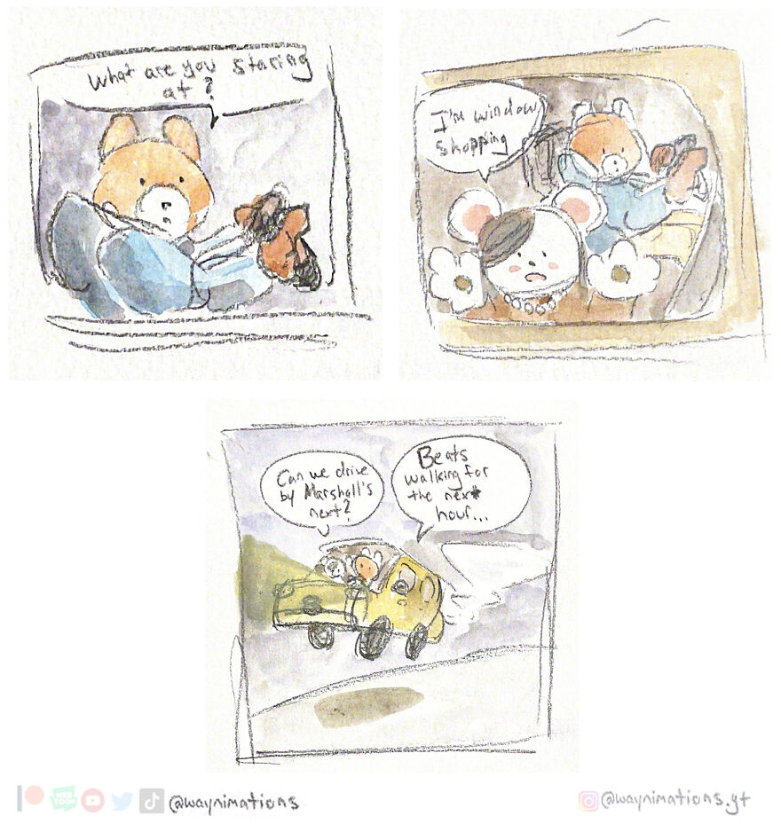 If you would like to read more, you can find new comic strips every Wednesday at 3 PM on Webtoon Canvas or on Instagram. More info: Instagram | webtoons.com | youtube.com | beacons.ai All my comic strips are traditionally hand-painted using watercolors after I ink my panels with a micron pen. It takes a lot more time than doing it digitally but the results are much more rewarding to me. I also like to physically hold each panel, so I think that’s cool too. Growing up in a low-income household, my parents brought me to libraries where I read a lot of comics and manga. I read a lot of “Calvin and Hobbes” by Bill Watterson and I honestly think that changed my brain chemistry as a kid. Other titles like “Peanuts” by Charles Schulz, “Haikyuu!!” by Haruichi Furudate, “Yotsuba&!’ by Kiyohiko Azuma, and Dav Pilkey’s “Captain Underpants” were comics that were instrumental in my development. My art is also heavily influenced by the music I listen to. I don’t create playlists so I will shuffle between Teezo Touchdown, Daniel Johnston, Hank Williams, or even Kero Kero Bonito. As somebody who paints, I look into artists like Edward Hopper, Francisco Goya, and George Bellows. There are so many more things that influence my work but I will leave it to you to see if you can pick out any influences that you may find in my work. That is one of my favorite things to do to other artists too. Follow Bored Panda on Google News! Follow us on Flipboard.com/@boredpanda! Please use high-res photos without watermarks Ooops! Your image is too large, maximum file size is 8 MB.