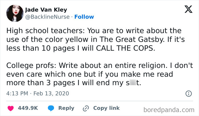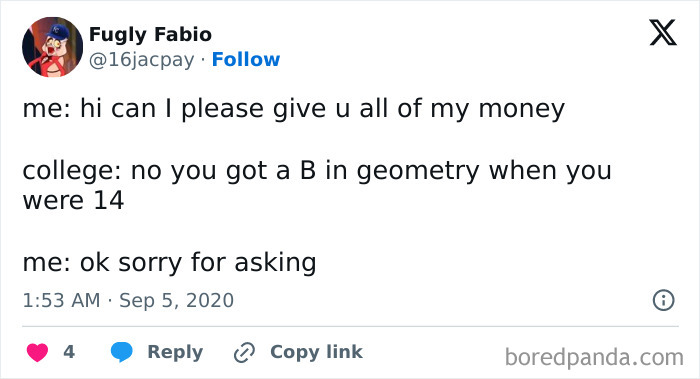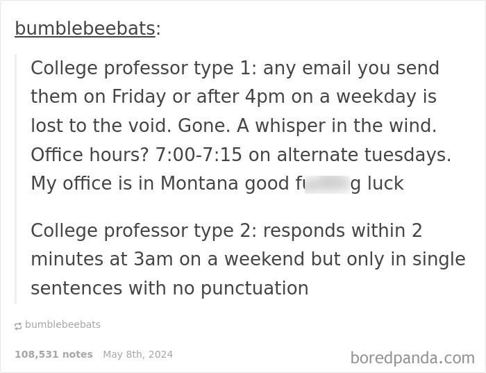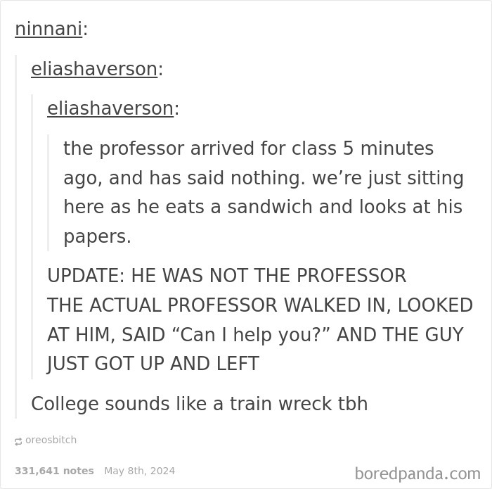 Netizens share their hilarious, chaotic and relatable thoughts on what going to college is really like. From zany professors, terrible diets to academic burnout and late night shenanigans, get comfortable as you scroll through, upvote your favorite examples and be sure to add your own thoughts and experiences in the comments section below. Follow Bored Panda on Google News! Follow us on Flipboard.com/@boredpanda! Please use high-res photos without watermarks Ooops! Your image is too large, maximum file size is 8 MB.