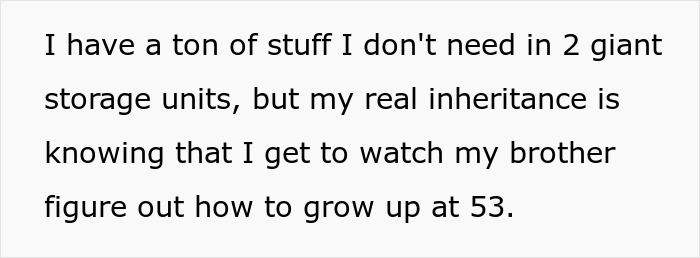 According to the Original Poster (OP), her brother is 53 years old, and throughout his already quite long life he has always tried to live off his parents, who helped him buy a car, pay rent – and even pay child support. But, like everything in our lives, this ended when their mother died a few years ago. After that, the brother began to drink more and more, allowed himself to treat his elderly father badly, with whom he, however, continued to live – and such a lifestyle actually ended in arrest for him. While the brother was behind bars, our heroine stepped in – and it so happened that she was the one who took care of her dad in the last five months of his life. The old gentleman opened her eyes to her brother’s behavior, and admitted that he wanted to change the will in favor of OP and her 10-year-old nephew. So they did. And so, when the old man passed away, and the author’s brother was released, his first act was actually to rush to the bank to change the funeral so he could get the death certificate. He also showed up and demanded the OP leave his mobile home – but then an unpleasant surprise awaited him. It turned out that the deceased had deeded all the land to his grandson, and everything else was supposed to go to the original poster – so she worked hard to make sure that nothing, not even a single fork, went to her bro. Her cousins, children and husband willingly helped her with this. Finally, the lady turned off the power, the water, the trash and the internet. The man was left with a car, which also needed to be refinanced, and a trailer, for which the remaining mortgage payments needed to be made. Well, the original poster reasons, 53 is not the best age to finally grow up – but she will be rather glad to observe it… Share icon Image credits: freepik / Freepik (not the actual photo) “Unfortunately, such stories are not at all uncommon, and everything actually begins several decades before, when parents spoil one of their children, allowing them literally everything, any whims,” says Irina Matveeva, a psychologist and certified NLP specialist, with whom Bored Panda got in touch for a comment on this tale. “And then years pass, the person becomes an adult – but only nominally, because they are used to the fact that all problems will be solved by their parents. And parents are often no longer able to deal with these problems. Or no longer want to. But the process that was started decades ago can no longer be stopped…” “In fact, to be honest, I’m not sure that this man will be able to cope now. He has been used to relying on others in his life for too long. But, be that as it may, this should be a very important lesson for him,” Irina sums up. Many people in the comments to the original post are also almost certain that nothing good will come out of all this for the author’s brother. “Nephew is going to lose that property when his dad fails to keep up with the taxes,” one of the commenters wrote. “Go talk to the bank and see about if you can buy the land when it gets repossessed,” another person almost urged the OP. In any case, the vast majority of responders here are confident that the original poster’s father made the right decision regarding changing the will. “Smart for your dad to make a will,” another commenter wisely summarized. And do you, our dear readers, also agree with this point of view?