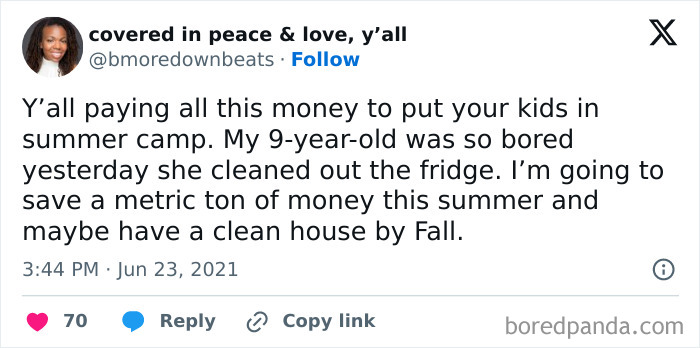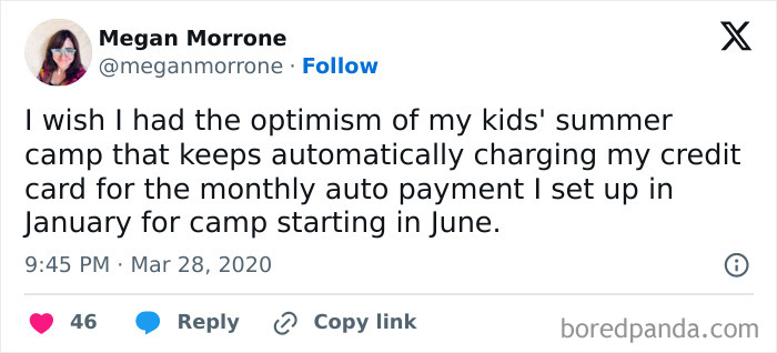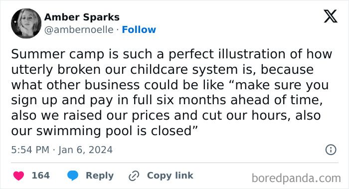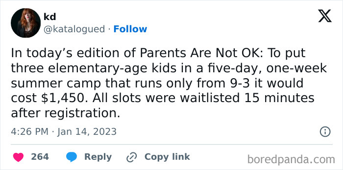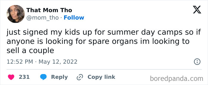 Since that is a common struggle for many parents with summer fast approaching, quite a few of them voice their concerns or honest opinions about it online, and we want to celebrate their creativity in doing so. From comparing it to buying Taylor Swift tickets or entering the Hunger Games to vividly describing just how frustrating it can be, these parents on X (formerly Twitter) got painfully honest about it; you can find some of their best posts on the list below. For many of them, summer camp is a place that combines both time outdoors and people of similar age who often are—or have the potential to become—their friends. According to Statista’s data from August of 2020, nearly a third of parents in the US were planning to or have already sent their children to a summer camp. The study also found that when children establish a good relationship with the camp’s staff, they are more likely to enjoy their time there and make nice memories. And it seems that as long as the connection with the personnel is strong, neither the children nor the parents care too much about the staff’s qualifications. (Though, camp operators know how crucial qualified staff is for the success of the camp.) No matter the length, though, camps can provide children and young adults with invaluable life lessons and unforgettable experiences. In addition to the friends and the activities that a summer camp experience typically entails, attendees also have the chance to acquire certain skills and boost their confidence. “After all, at camp kids set and clear their tables, they clean their cabins, they get themselves to activities on time (wearing the right clothes and with their life jacket or canoe paddle or riding helmet), they fill and empty their own laundry bags,” the director pointed out. Research on how summer programs influence outcomes for children and youth found that summer camps can be designed to have a strong positive impact on their safety, their physical and mental health as well as social and emotional development, and their academic learning. But if you belong to the second group, you probably also know just how costly they can be. According to ActivityHero’s 2023 data, parents paid close to $96 dollars a day for a week at day camp, as prices had reportedly increased by more than 12% by said year, which explains quite a few parents’ posts on this list, describing the sacrifices they might have to make in order to afford it. Dispute charges, get refund, cancel summer camp, raise your own children for the summer, and key word let them be kids outside. Make them go outside for at least an hour or two every day. Follow Bored Panda on Google News! Follow us on Flipboard.com/@boredpanda! Please use high-res photos without watermarks Ooops! Your image is too large, maximum file size is 8 MB.