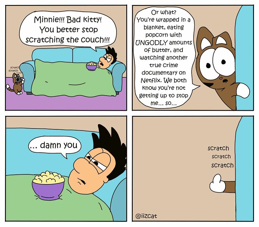 This change shows he’s grown a lot as an artist. He also learned that it’s important to make comics for himself first, even though he’s happy when other people like them too. His experience teaches us that getting good at something takes a lot of practice, and it’s okay not to be perfect at the beginning. People enjoy his comics about living with cats because they can see their own experiences in them, which makes everyone feel more connected. More info: iizcat.com | Instagram | Facebook Nick cherishes receiving photos from fans showing their cats mimicking Minnie’s antics. He finds joy in every message and feels bonded with his audience over their shared love for cats. “My favorite is seeing a fan send me a picture of their cat doing the exact same thing Minnie does in the comics. That never gets old!” I’ve learned that I do need to make and dedicate time to create and draw. And sometimes I’ll doodle for hours and “nothing” comes from it. I don’t always have a comic or idea finished during each session, but it’s not wasted. It’s good just to play and have fun with things." My latest comic was inspired by one of my daughter’s favorite bedtime books called “Goodnight, Moon.” I took that concept and mixed it with some cat spices and out came that. There’s also plenty of ideas that I shelve because they are not fully baked, then I’ll come back to it days, weeks, months later when the idea finally finishes in my head. Also, like I mentioned above, sometimes all you need to do to get inspired/get over that creative block is to sit down and play. Not every session needs to be a finished product. Sometimes I’ll just draw Minnie and silly expressions or random thoughts. Sometimes a comic comes out, many times it’s just a bunch of scribbles." I would be lying if I told you I’ve found what works and what doesn’t. Sometimes it seems pretty random. I’ve had some posts go viral and other very similar posts barely move the needle. Or I’ll share a comic and it doesn’t get much traction, but then I’ll share that same comic a few months later and it goes nuts. The one thing I know that I can control is the content I create so that’s where most of my energy goes." Follow Bored Panda on Google News! Follow us on Flipboard.com/@boredpanda! Please use high-res photos without watermarks Ooops! Your image is too large, maximum file size is 8 MB.