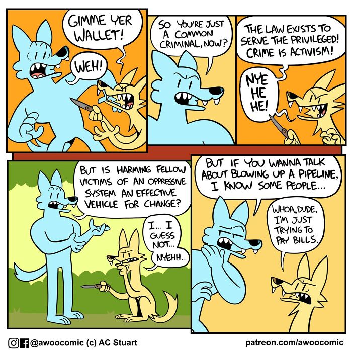 Awoo! comics, by Andy Stuart, are anything but very sweet. The themes that the artist explores are usually silly and uplifting. To get a better understanding, Andy has described the essence of his artwork himself: “The Awoo! comics came after years of making more cynical things. Setting aside time each day to put my brain in a positive space and think about guileless, wholesome comics ideas is therapeutic in a way I could not have imagined. I’ve become a more mindful and gentler person from years of making these comics. And I guess that’s the essence of them, to me. Now and then I’ll slip up with a cynical joke (that jaded humorist is still within me) but for the most part, the jokes aren’t about cruelty or cynicism. Just silliness and the best feelings in life.” More info: Instagram | fenrispublishing.com First of all, Andy told us more about himself and his background. “I began my career as a professional cartoonist as a staff illustrator at CollegeHumor in NYC, alongside many of the most talented people I’ve ever met. If you know of Drawfee, those were my co-workers! It was great. While I was there, I primarily worked on a series called Ben & Steph, though I did a good mix of other things as well. After that, I primarily worked on my two series for WEBTOON, Behind the GIFs and Elf & Warrior. Along the way, I’ve made a lot of random little projects (Your D&D Stories, Taterpig, etc.), but these days I’m mostly working on Awoo!” “I wish I could better convey my creative process, because that might mean I understand it. Sometimes the ideas just come to me. More often, I meditate on jokes and ideas while doing something that doesn’t require active attention—driving a long way on the highway or taking a long walk—and get a lot of my writing done that way. Sometimes I just have to sit down with my laptop and spend a few hours coming up with things. It’s a lot easier when the project is new, and every idea you have is valid and tenable. Once the identity of a project is more firmly established, you have constraints to work within, and it’s very easy to lean on jokes that are just about the characters. But that gets old fast.” “I hope the audience takes away some modicum of the peace that making the comics brings to me. A little respite in the madness of social media is nice, anyway. But I put myself in a very intentional mindset to make these, and doing that as a habit has been healing. I hope some of that gets through to the readers.” “First, a big ’thank you’ for reading, obviously! If they like the comics and want to support them, Volume 1 of the printed collection of Awoo! is available at Fenris Publishing. I have the second volume coming out later this year. They can also keep an eye out for a re-run of the Makeship plushie campaign by following me on social media. And of course, if you want to chip in, Patreon. Thanks again!” Follow Bored Panda on Google News! Follow us on Flipboard.com/@boredpanda! Please use high-res photos without watermarks Ooops! Your image is too large, maximum file size is 8 MB.