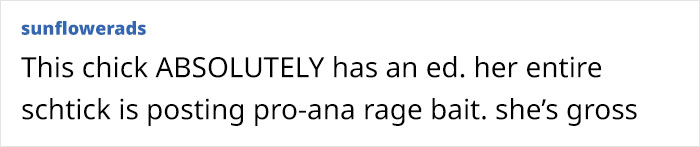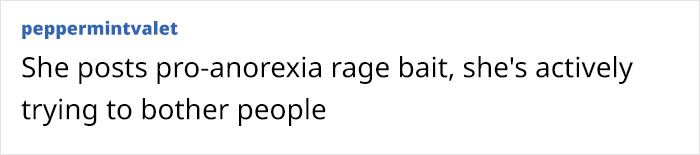 “She posts pro-anorexia rage bait,” a Redditor commented