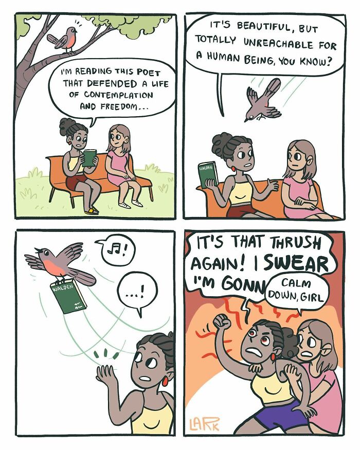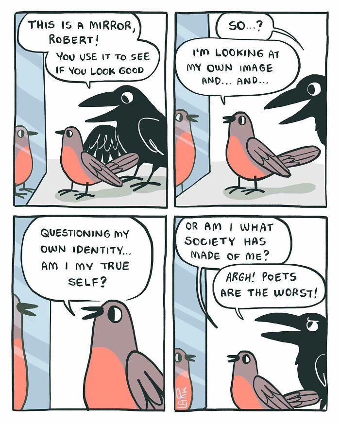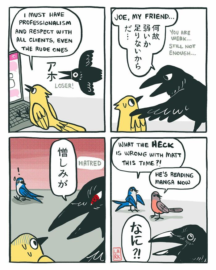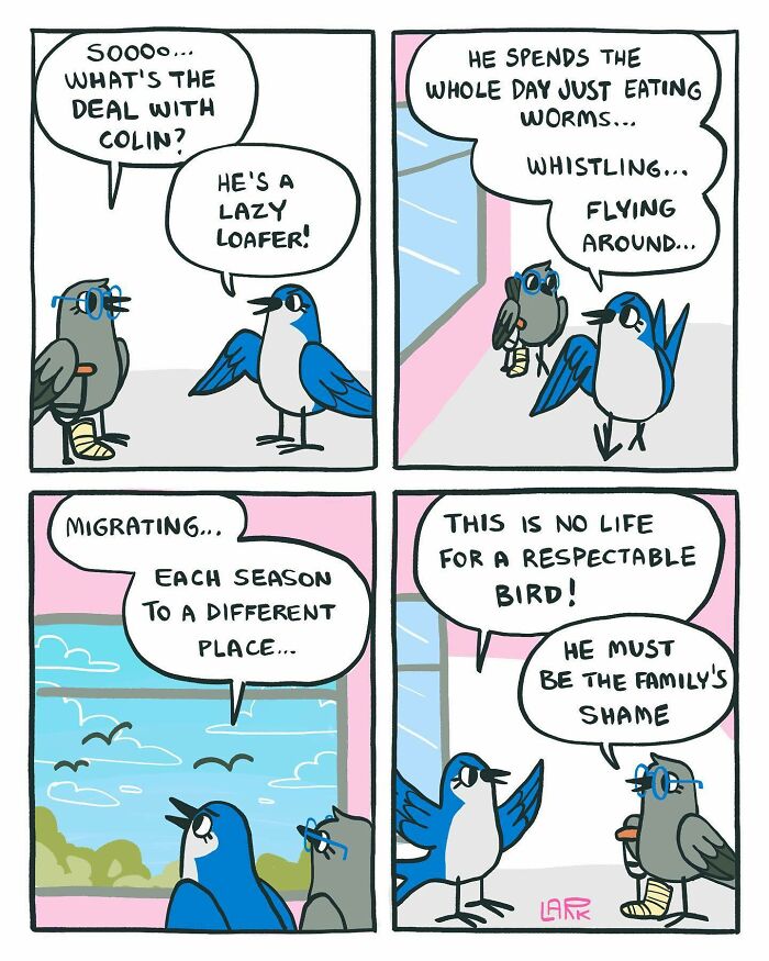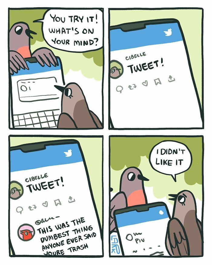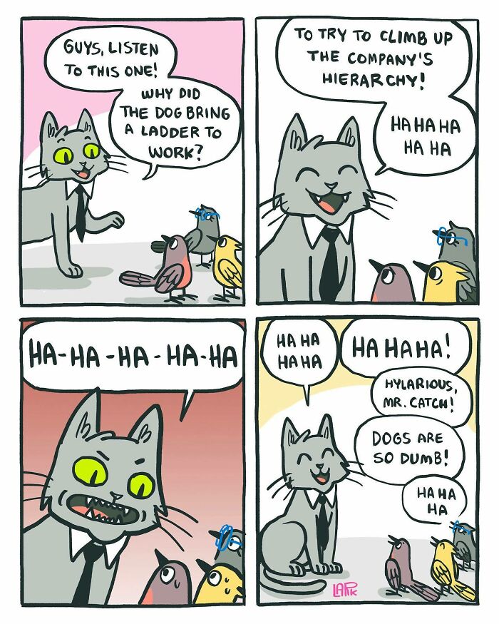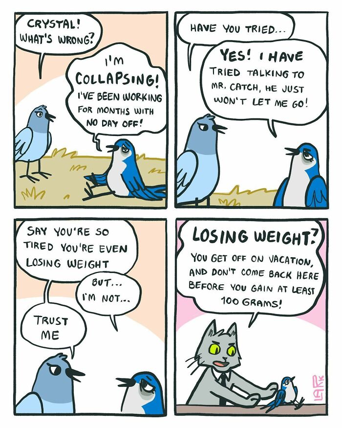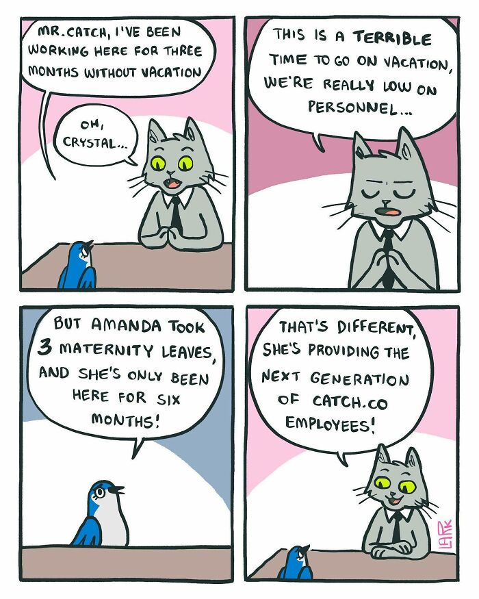 The artist, who goes by Lark, was mesmerized by how she felt more connected to birds chirping, rather than the information her boss was blabbing about using very corporate phrases that made little to no sense. Lark shared: “‘That bird’, I thought, ‘is so much wiser than us to never set foot in a place like this and chain itself to our stupid lifestyle…’ But, what if it wasn’t so wise? What could possibly make a bird, born wild and free, give up on its freedom and start working the way we do? What is it that really separates us?” This is the question that started a comic series. Lark imagined the birds to be working in a corporate job at Catch.co, run by a cat CEO called Mr. Catch. This absurd premise turned into hilarious scenarios that we, as people, can also relate to. So, without further ado, let’s hop into this rather bizarre yet familiar world of working birds. More info: Instagram | catarse.me | TikTok First of all, the artist shared what challenges she faces regarding translating her own work experiences into comic form. “One of my biggest challenges in making not only comics, but comic strips, is the format and size of the media I have to work within. Comic strips are usually 2-6 panels long, and in my case, they have to fit a single Instagram post. Sometimes I want to convey complex ideas with the story, and I have to manage to, somehow, fit them into this limited space. With many years of practice, I’ve learned to exercise economy when writing: what’s the smallest amount of drawing and text I can do to completely express this exact message? That’s what I have to do. Many times, you have to leave some of this message between the lines and trust the readers will be able to read it. As an author, it is your responsibility to communicate what you want, but it’s very satisfying and rewarding when readers meet you halfway and get the subtext even if it’s not obvious!” explained Lark. “Probably one of my favorites was our end-of-the-year gift from the company. Where I live, it’s a custom for companies to give all employees a gift for the holidays. It’s often a box full of nice food and treats, and sometimes it comes with a really nice present, like speakers or something more expensive. There was this year when the company I used to work at gave everyone just a pair of socks, as a joke because socks are universally known to be a bad gift (the true joke was that they really thought they were being “disruptive” and employees would actually like it). Of course, everyone hated it and complained about it with their leaders. We spent the holidays watching people from other companies posting all the nice gifts they got, and we were stuck with a cheap pair of socks. But the unbelievable part of it was that next year, people had great expectations that, to compensate for last year, they’d get a nice gift for a change and they all got….. socks AGAIN! At that time, I wasn’t working there anymore, but a former coworker told me about it and I couldn’t help but make a comic implying that every year, Mr. Catch (the bad-guy-boss cat that runs the office in my comics) would steal his human’s socks to give as gifts for the employee-birds!” “As I said before, the room each social media offers to share my art has a huge impact on the shape and size I give each comic strip. But my favorite thing about it is the comments section. I always read all the comments, it gives me an idea about how the public is receiving the story, if they understand the plot and the punchline, if they like or dislike each character, and what they expect to happen. Part of building the story is giving people what they want, but to be an author is to find the delicate balance between attending the public’s demand and twisting their expectations in order to surprise them.” Also, that I always add subtle details to many scenes and characters, I hope you enjoy finding them!” Follow Bored Panda on Google News! Follow us on Flipboard.com/@boredpanda! Please use high-res photos without watermarks Ooops! Your image is too large, maximum file size is 8 MB.