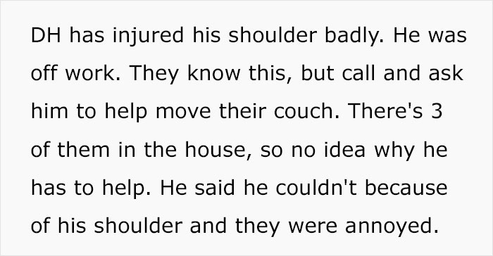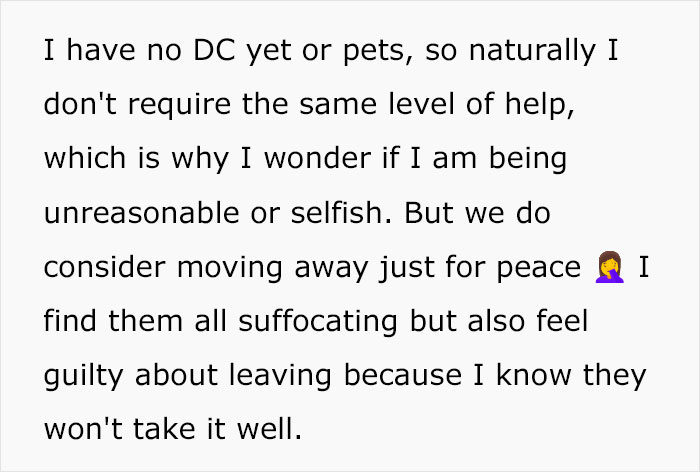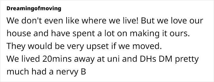 Such was the case of the original poster (OP) as both her and her husband’s families constantly asked for their help for the smallest of things, and got annoyed if they refused. The couple was so done with this that they decided to move just to avoid their family! More info: Mumsnet