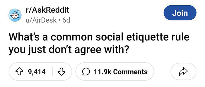 Sometimes etiquette rules just don’t make sense, so why adhere to them? This netizen had a similar idea when they decided to ask: “What’s a common social etiquette rule you just don’t agree with?” The thread started some heated discussions over whether we really should respect our elders and whether it’s okay to tell someone they have food bits in their mouth.