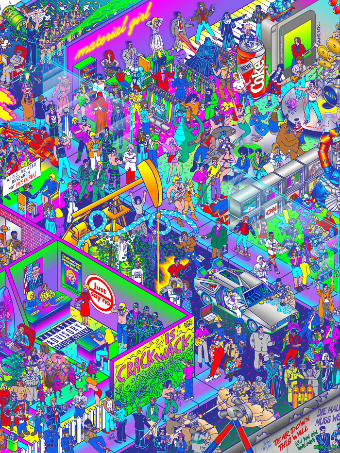 ‘Eighties Excess’ is a detailed illustration featuring people and events from the decade. Although it may look bright and colorful on the surface, if you dig deep enough you can see some pretty dark elements hidden there, both real and fictional. In total the artwork contains 350 references! You can play the game and see how many you can find as well! Just visit: https://akberl.in/1980s/. Prints are available here. Now without any further ado, let’s rewind back to the 1980s, where audacious fashion – bigger hair, brighter colors – mirrored the “go big or go home” attitude. Video games boomed, Wall Street roared, and Miami Vice set the style. Thriller chilled, Ghostbusters thrilled, and Transformers rolled out, while graver realities like AIDS, crack, and the Cold War simmered beneath the surface. More info: akberl.in | shop.akberl.in Share icon Share icon Share icon Share icon Share icon Share icon Share icon Share icon Share icon Anyone can write on Bored Panda. Start writing! Follow Bored Panda on Google News! Follow us on Flipboard.com/@boredpanda!
