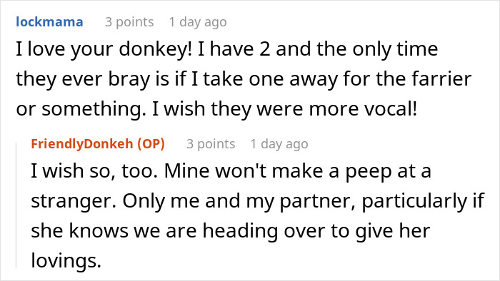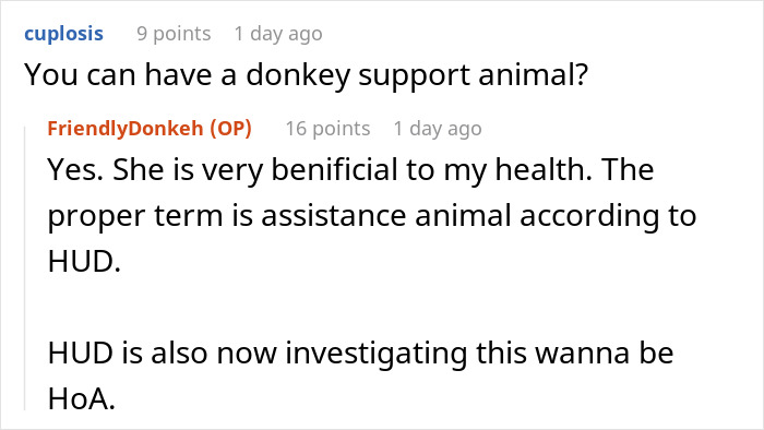 Let’s start at the beginning. This isn’t your run-of-the-mill HOA story where they complain about lawn lengths and mailbox colors. No, this particular group of busybodies decided that maintaining roads and a sewage system was just too much work. Instead, they’ve put all their energy into managing a golf course and making life miserable for everyone around them. They’ve even earned themselves a gold star in the neighborhood bully department by harassing a terminally ill neighbor over a deck that was apparently 18 inches too big. Classy, right? They also planned on making it illegal for women to walk around topless, as they were disturbed by the fact that the OP was walking her donkey topless on her own property. Now, donkeys aren’t exactly known for being loudmouths, but when this one decided to let out a little bray, the local “HOA” was losing their minds. You’d think the donkey was throwing wild parties every night from the way they reacted. So, their latest brilliant idea? A lawsuit to remove the donkey under the claim that her braying was just too much for their delicate ears. They even went so far as to ask a judge for a restraining order against the poor donkey. The judge’s response? “How often do donkeys bray?” The HOA’s lawyer, clearly a donkey expert, stammered out, “Periodically,” which is legalese for “I have no idea.” Luckily, the judge dismissed this ridiculous claim as the OP relies on her donkey heavily. You see, the OP has been struggling with mental health for most of her life and her donkey, which is an emotional support animal, has helped her get through each day. Emotional support animals (ESAs) provide their humans plenty of benefits, especially to those who are dealing with mental health challenges. Unlike service animals, which are trained to perform specific tasks, ESAs offer comfort and companionship that can alleviate symptoms of anxiety, depression, and stress. For someone like the OP, her donkey isn’t just a pet, but more of a lifeline that helps her stay on track and deal with daily life. The presence of an ESA can make a big difference in someone’s life, as it can provide a sense of security and emotional stability that traditional treatments alone might not offer. Share icon Image credits: Pixabay (not the actual photo) If you’re thinking, “This story can’t be real,” the OP has receipts, including a video of the HOA crying over property values at a replat hearing (the process of redrawing or altering the boundaries of an existing subdivision or parcel of land). There’s even an EPA paper detailing their sewage-dumping shenanigans. To find out more about this story, Bored Panda reached out to the OP for some comments. She told us that the improvement district is not a homeowner’s association, but they just act as if they have the power of an HOA by enforcing covenants. “Usually they do so with threats, I am the first to stand up to it. Their main job is supposed to be maintaining the sewage systems. They have allowed too many homes to be built on for the current system, thus needing another 2 million to build a lagoon. Some of those homes, of course, are rentals by board members,” the OP explained. We asked the OP how this association gets their funding. She said that “They get most of their revenue from our property taxes. I myself have been charged 80k for their sewage taxes so far, even though I bought my house for only 108k. They’re getting ready to charge all properties another two million due to the dumping in the lake.” We wanted to know why this so-called HOA asked for a restraining order against her donkey. The OP told us that “They think my donkey barely braying is a nuisance. I think they’re just bitter that they can’t bully me, and on the very rare chance they hear my donkey bray, they somehow take it personally. My donkey only brays when she’s happy to see me, such as when I say good morning to her.” The OP, who has been struggling with mental health for a long time, heavily relies on her donkey. She told us that “If my donkey is not safe, I am not safe, or so my PTSD strongly insists. I don’t know why everyone wants to mock me for having an ESA (emotional support animal) and not a ‘service’ animal. I need her here with me, not in Walmart.” We asked the OP why this improvement district is so disturbed by the way she dresses on her own property. She said that “The improvement district hates that I walk my donkey topless. They’re bothered because they’re sexist. I am the reason it is legal here, county and city-wide, for women to be topless. They currently shout insults at me for being religious yet being topless as a female, as if those two things aren’t compatible.” As a sign of protest to this fake HOA, the OP strategically placed a welcoming sign on her property, which is conveniently located at the entrance of the neighborhood, informing people about this circus of an HOA, with a giant dad joke about the sewage they’re dumping into the lake. It’s a fitting tribute to the pile of… well, you get the picture. What’s your take on this story? Share your thoughts and comments below.