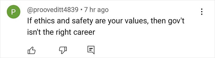 “If ethics and safety are your values, then government isn’t the right career,” a reader commented