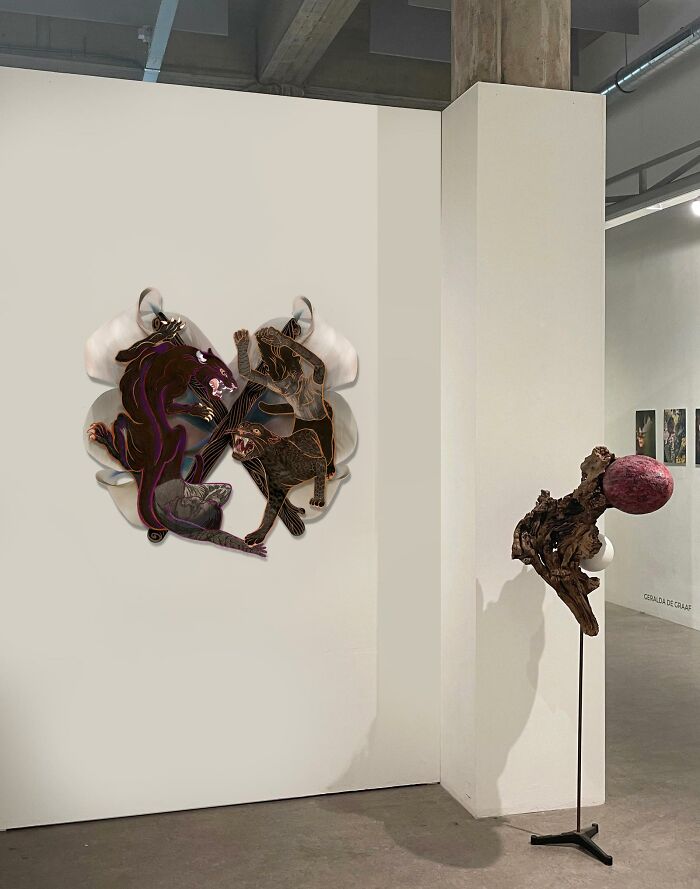 Our attention was drawn to the stunning work of Lisa van Noorden. Her creations are aesthetically appealing and meticulously drawn, yet imbued with a sharp edge that captivates our attention. Lisa herself appeared in the gallery to offer insight into her creative process. Her latest work focuses on natural forms: flowers, plants, and animals. “It is a reflection of my personal view on beauty, but also on the strength, survival instinct, and cruelty inherent in the natural world.” More info: Instagram | lisavannoorden.nl Lisa’s work always revolves around resilience and survival strategy. That was also the theme she started with for this nature work. “Before this, I made many portraits. In them, I depicted the complexity of human identity and the various ways individuals protect themselves and adapt to challenging environments. From starlets who use their sexual allure to thrive in a venomous environment to child soldiers who wield their weapons to survive.” With this new collection, her focus shifts from humans to nature: animals, plants, and flowers… which, like humans, constantly evolve in their survival strategies. We then approach a piece called “Panther & Tiger descending,” climbing down a tree with vines, heading towards prey. Behind them, an orchid is visible. “It’s not clear who will win, who will get the prey. The conflict, the survival of the toughest, is imminent. The orchid as a backdrop is a very tough plant, a sign of resilience and adaptability. The work is a glimpse into the eternal struggle for survival and confronts the viewer with the thrilling question: who will triumph?” The last piece we see is called “Grip of Confusion.” “This work depicts a black panther restraining a sleeping or wounded girl and a leopard shielding a wounded boy. Are the children prey or are they being protected?” “Grip of Confusion” refers to the bewildering paradox inherent in the scene: on one hand, these majestic animals are protectors of their species, but on the other, they are forced to subdue those whose actions lead to the widespread extinction of their kindred. Through this symbolism, viewers are invited to contemplate the consequences of human encroachment on wildlife habitats and the resulting conflicts within the natural order. The tension depicted in the artwork is like a poignant reminder of our responsibility to coexist harmoniously with the creatures that share our planet. Ultimately, “Grip of Confusion” urges us to question our relationship with the environment and the ethical implications of our actions. Her focus on resilience and strategy is consistent throughout her entire body of work, from portraits to her recent exploration of natural elements. The shift from human to natural motifs in Lisa’s work illustrates her ongoing evolution as an artist. Always embodying the struggle for survival, she challenges the viewer to reflect on resilience and adaptability. Since graduating from the Willem de Kooning Academy in 1990, Lisa has always experimented with different forms and techniques but remains fundamentally a draftsman. Her current collection, with its spontaneity and energy, marks a new phase in her artistic journey. Follow Bored Panda on Google News! Follow us on Flipboard.com/@boredpanda! Please use high-res photos without watermarks Ooops! Your image is too large, maximum file size is 8 MB.
