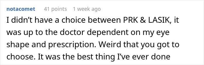Even though we’ve made a lot of technological advancements when it comes to surgeries, no procedure is completely without risk. A sensitive procedure like lasering one’s eye, especially, can have possible complications. That’s why the poster’s doctor explained the different types of procedures at their disposal and the side effects that could occur. To better understand this complex procedure, Bored Panda contacted Anton Hong, a practicing optometrist in Australia. He completed his optometry training at the University of Auckland in New Zealand. He also uses his YouTube channel to share information about vision and eye health. We asked him what kind of complications a person could face if they got their eyes lasered. Anton told us that “complications are extremely rare, but the most common form is generally flap-related (a flap is created during LASIK to expose the inner part of the cornea so it can be reshaped and is put back on after the treatment).” “Complications usually arise when the flap doesn’t stick back on properly, and EyeWiki reports an incidence of about 0.7-6.6% of such cases. Another minor complication is dry eyes because the procedure involves ablating the stroma of the cornea (surgically removing the cornea’s outer layer), which contains nerves that regulate tear production,” he explained. We also reached out to Dr. Joseph J. Allen, a practicing optometrist and the founder of Doctor Eye Health–an educational YouTube channel with over 1 million subscribers. He told us other possible complications could be “visual disturbances like glare, halos, and reduced contrast sensitivity, especially in low-light conditions, which can affect activities like night driving.” Dr. Joseph explained that “these issues occur due to temporary changes in the cornea but often improve as the eyes adjust during recovery. Recent advancements in laser technology, such as wavefront-guided treatments, have significantly reduced the risk of optical aberrations and improved outcomes for glare and halos.” One of the most profound things the author said in their post was: “The things I lost feel almost as valuable as the things I gained.” The double vision, dry eyes, and difficulty stargazing, even five years later, all made the poster doubt their decision to get laser eye surgery. Anton Hong told us that “an overwhelming majority of patients I see post laser surgery say that it was the best thing they’ve ever done. Keeping in mind the surgery allows them to live their lives without having to rely on glasses to carry out daily activities.” Share icon Image credits: Mantas Hesthaven / Pexels (not the actual photo) We know that the poster regretted their decision to go through with the procedure, but that’s not really the norm for folks who choose to do it. Dr. Joseph J. Allen explained that “for LASIK, a review of outcomes from over 67,000 eyes revealed that 99.5% achieve 20/40 vision or better. In contrast, a 2016 review reported that 1.2% of patients were dissatisfied with LASIK eye surgery.” It might seem like a small percentage until you realize what a massive effect the surgery can have on a person’s life. That’s why we asked Anton Hong if he had any advice for folks considering such a procedure. He told us that “laser surgery is designed to correct distance vision, and so I get a lot of patients having near vision problems asking whether laser surgery is an option to help with their reading (it is possible but not recommended).” “I would also weigh out the risk-to-reward ratio of having the surgery, for those that are highly near-sighted and must wear glasses for basically any task, laser surgery would yield more reward relative to the risk. If, on the other hand, you don’t mind wearing glasses to do a handful of tasks, then perhaps the benefit of the surgery may not be as large,” he said. Dr. Joseph J. Allen also added that “it’s crucial to start by seeing a qualified eye care provider who specializes in refractive surgery. They will conduct a comprehensive eye exam to assess your overall eye health and determine whether you’re a good candidate for the procedure. One of the most important aspects to evaluate beforehand is dry eye disease, as pre-existing dry eye is the primary risk factor for developing dry eye after surgery.” “It’s also essential to have a thorough conversation with your provider about your expectations. Reflect on what you hope to achieve from the surgery, and discuss this openly. Setting realistic goals will help your surgeon determine whether laser eye surgery is the best option for you or if alternatives may better suit your needs,” he added. The risk versus reward debate over LASIK can go on forever. If you, like the OP, struggle with vision issues, then it’s best to weigh the pros and cons of laser eye surgery. Make sure to also listen to doctors and people’s personal experiences. Then you must ‘see’ for yourself, whether it’s for you!