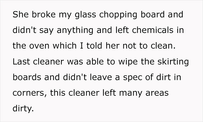 The living room window sill was unclean, and she broke her glass chopping board, left chemicals in the oven which she was asked not to clean, and the floor corners were dirty