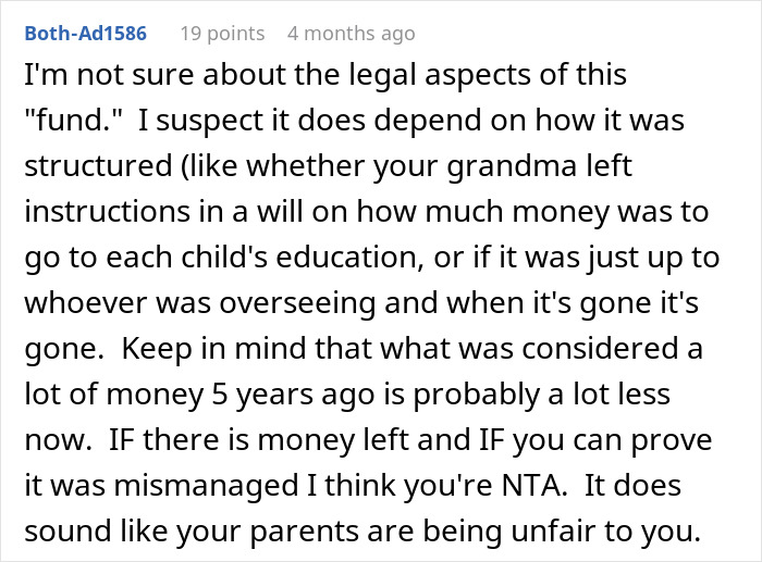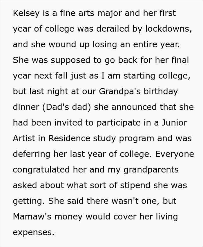 The OP had the idea that after graduating from high school, she’d go to school for the degrees needed to pursue a career in her dream field – meteorology. Nearly all meteorologists have bachelor’s and master’s degrees, but a PhD is becoming common among them too. As you may know, in many countries studying at university costs a pretty penny. So, the girl was planning to cover her tuition with a mix of a scholarship and her inheritance. An inheritance can exist in many forms. Some people leave their heirs real estate stocks, while the OP’s grandma, or Mamaw, left her grandchildren a college fund. The fund’s supervision went to one of the author’s mom’s aunts. Sadly, she passed away just 2 years after Mamaw, so the OP’s parents ended up in charge of it. Now, here’s where things got messy. The OP’s sister Kelsey is a fine arts major. Instead of her final year at school, she was invited to the Junior Artist in Residence study program. Typically, in these types of programs, a person gets a chance to collaborate with artists, organizations, and communities. It provides an artist space and resources to support their artistic practice. So, naturally, the family was happy that their member got such a chance. Until the question about finances came up. Apparently, the young woman was planning on using Mamaw’s money to cover her living expenses. Unfortunately, if she did this and the author used some of it for her college tuition, the fund would soon be empty. That meant there would be no money to pay for Kelsey’s final year of school. So, the parents came up with a plan. They would give what was left of the fund to the OP’s sister, while the OP herself could get a student loan. They would also take out a loan on the house themselves to cover the leftover expenses of their older daughter. Basically, everything would be given to Kelsey, while the author would have to fend for herself. That’s when the evening was ruined, as it turned into a fight. After the parents, other family members came up with the idea of suing the OP’s parents for mismanaging her inherited college fund. Plus, they said she could get a lien on their house so they couldn’t use it to get a loan. This made the girl wonder – is she a jerk for even considering this? Well, many people online didn’t think so. The parents mismanaged the money and now her dream career is at risk because of it. Share icon Image credits: Freepik / Freepik (not the actual photo) At the same time, others had a few more questions about the whole ordeal. For instance, were there any legal conditions about how the fund was supposed to be spent, or maybe it wasn’t as big as everyone thought? So, the 17-year-old came back with an update. In it, she acknowledged some legal inaccuracies (like about the lien on a house) she wrote in the original post. She also gave more context about her parents’ history with money. Apparently, her whole childhood, they struggled with money, because they always mismanaged it. Her grandparents used to help with their bills, and Mamaw even left them the house. That’s why they weren’t the first people trusted with the fund. Growing up in a family that struggles with money can affect a person for the rest of their life. When parents are stressed about money, children can internalize that anxiety. So, when they grow up, they might start spending recklessly or become overly financially restricted. Well, we don’t know whether the author has been acting out in any of these ways yet, but from her update and comments it’s clear that she’s wounded by her parents’ financial carelessness. So, it’s normal that when she had everything planned out and they pulled the rug from under her, she got angry. She’s not the only angry family member. Her brother, who this plan leaves penniless, is too. Just like her grandparents and aunt and uncle. Now, they want to move as quickly with the legal case as possible. Before the parents do something else stupid, like spending the rest of the fund or getting a loan on the house. Meanwhile, the OP is set to go to college – she wants her dream career. Even if she has to take out loans to cover the costs, she’ll do it. That’s where the story ends; there are no updates yet. So, we can’t be sure whether the family ended up suing the parents or not. Perhaps they all were able to find another way to solve this. All we hope is that the author is successfully studying for her career without letting all this drama ruin it.