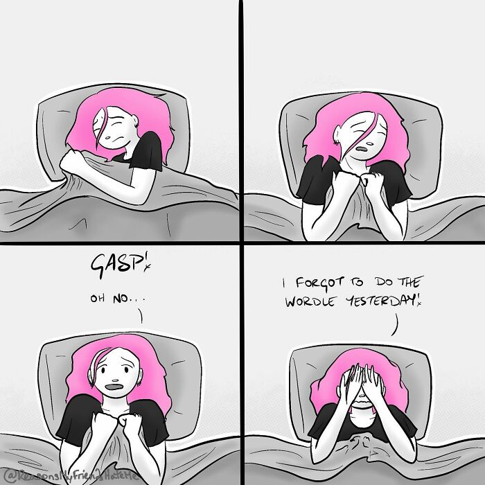 So, without further ado, let’s hop into the post and see what Aylia has created since her last post. More info: Instagram “When I’m working on a new comic, I’ll usually put on an episode of a show I’ve seen many times and work on the comic while the TV is providing comforting background noise. Ah, the dulcet tones of Nick Miller. Depending on the content of the comic and how complicated/intricate it is, it will take anywhere from 1-3 hours to complete.” The artist responded: “I don’t officially ‘scrap’ an idea if it turns out I don’t like it… I just let it sit, incomplete, in the ether, with the idea that one day maybe I’ll complete it.” “I think artists never really have a clear idea that their art is being received in a positive light, or if it’s being received at all. But I recently followed a newer account of a beginner who responded with a message thanking me for the follow and saying they were ‘starstruck.’ By me?? To all the artists out there, keep making art because you never know who’s seeing it and what it means to them.” Lastly, Aylia added: “Thanks for taking an interest in my series!” And that’s why couples should make love before getting out of bed. Follow Bored Panda on Google News! Follow us on Flipboard.com/@boredpanda! Please use high-res photos without watermarks Ooops! Your image is too large, maximum file size is 8 MB.