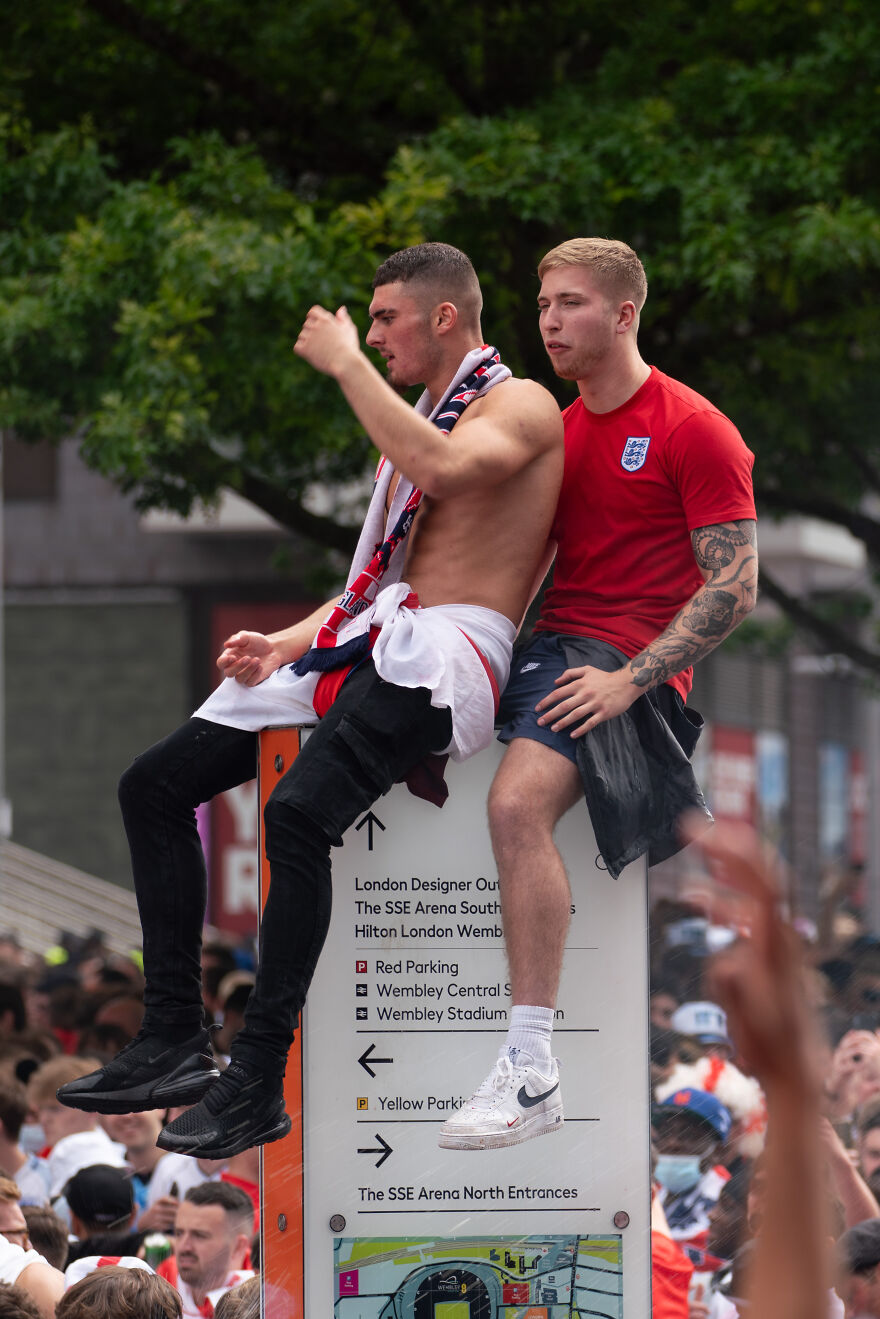 The photos were taken at Wembley Stadium, where there was a tense situation between law enforcement and supporters. The lack of tickets caused the tension to continually rise.