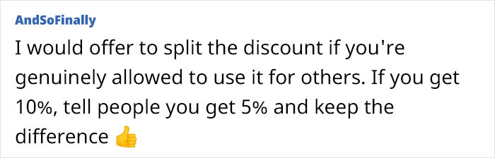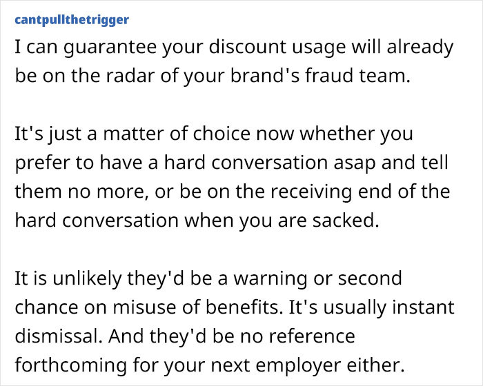 So, the Original Poster (OP) works for a luxury British brand and, in her own words, has a very generous staff discount. For quite a long time, the author had used this discount quite rationally – for herself, sometimes for her mother, sisters and sister-in-law. But, according to the laws of the genre, sooner or later such prosperity had to end… And so it happened – one fine day the SIL blabbed to her cousin, who urgently needed a gift for her daughter’s birthday. And our heroine, as a kind and soft-hearted person, could not refuse. And didn’t even reproach her SIL for not keeping the secret. As it turned out later, this did not lead to anything good. A real “domino effect” resulted – since then, both the SIL and her cousin, and also their numerous friends, many of whom the woman knew only superficially, have approached the original poster with various requests. And she didn’t actually refuse anyone. It even got to the point that this very cousin and her sister were planning a trip abroad, and asked the author to allow them to use her discount separately, so that they could buy gifts for their friends! And this, of course, irritated our heroine incredibly. Also because she actually doesn’t receive anything in return for such generosity – not even a single word of gratitude. So the original poster finally decided to ask for people’s opinions online – is she being unreasonable for getting irritated by this? Especially since, as she admits, her mom and sisters never asked her to help them by sharing her discount – because they know well that anything she gifts them will be from her work. Share icon Image credits: Consumerist Dot Com / Flickr (not the actual photo) Well, from a technical point of view, the original poster’s actions can be classified as “sweethearting” – that is, a specific form of abuse by employees of their discounts to benefit their friends and families. Moreover, according to research conducted by the NY Times, this is one of the most common forms of employee theft. Yes, that’s right – it’s considered theft. After all, in fact, a staff discount is given to an employee as a kind of incentive for working for this company, for being loyal to it for a long time. And when discounts are handed out left and right to people who have nothing to do with the company, this can technically be regarded as stealing money from the company. Moreover, this is a very common problem worldwide. “In fact, the NRF recently pegged the cost at approximately $100 billion per year. With roughly 1/3 of shrink being employee theft, it’s safe to say that sweetheart is costing businesses billions of dollars annually,” Solink’s dedicated article claims. And many companies have strict anti-fraud policies aimed at preventing sweethearting on the part of their staff. By the way, many commenters on the original post tried to draw the author’s attention to this. “In every company I’ve known, you can lose your job for this,” one of the responders wrote in the comments. “Just tell everyone they’re cracking down and you can’t do it anymore. They’re incredibly cheeky.” “If it’s allowed I’d do it. If not, just tell them it’s not allowed,” another person added. In other words, people in the comments sincerely urge the author to stop this practice before it’s too late. “Where I work, staff discount being used out of your immediate household is gross misconduct and a sackable offence. Can you just say ‘sorry, the rules have changed, don’t want to get sacked’?” someone reasonably suggested. And do you, our dear readers, also agree with this point of view? Please feel free to express your thoughts in the comments below.