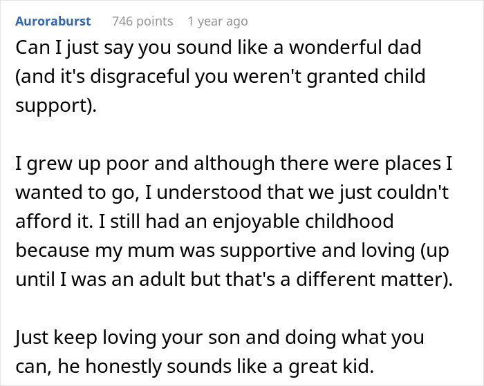 Whether by choice or by circumstances, there are many single parents out there who struggle to give their children the best life possible. Looking to get a better insight into how this all works and how to make it better, Bored Panda reached out to a children’s psychologist, Dr. Francyne Zeltser, who was happy to weigh in. The expert began by saying that while different single parents may face different situations, there’s one common challenge — they all parent solo. This means that they often have to struggle with “independent problem solving and/or making judgment calls on their own without a parenting partner to brainstorm with and/or get feedback from.” Francyne compared this situation to working on a group project. In the case of both parents, they usually work together or divide and conquer to get this job done. However, here, the single parent is mostly the sole contributor and has no one to help them with the task or take over when they need a break, which is why people like the OP may turn to complete strangers online for advice that co-parents tend to get from each other. When it comes to the child’s point of view, there are also plenty of challenges they might have to face. A few examples could be financial limitations, enrolling in childcare programs earlier than their peers, and having to spend more time alone while their parent is at work. However, at the same time, there is a pretty nice upside to it all. “Many children of single parents feel fortunate to have a close, trusting relationship with their only parent, sometimes, more so than children of two parents,” said the psychologist, adding that just like the OP and his son, they often share the “in it together” or “us against the world” mentality, which only helps them grow closer. Lastly, coming to the question that the author asked other Redditors at the end of his post, Francyne explained that while every situation is different and ongoing, open and honest communication is the key that helps parents explain, children understand, and everybody maintain mutual trust and respect. “The parent should do their best to explain the ‘why’ factually, at a developmentally appropriate level,” summarized the expert, adding that while a younger child may not understand budget constraints as well as an older one, doing this is important nonetheless. Ultimately, we can’t really choose what life we get. But whatever cards we’re dealt, it’s always wise to try and make the most of them. And if you ever find yourself in a similar situation and need inspiration, just think of the OP and Rory and remember that you’re never truly alone.