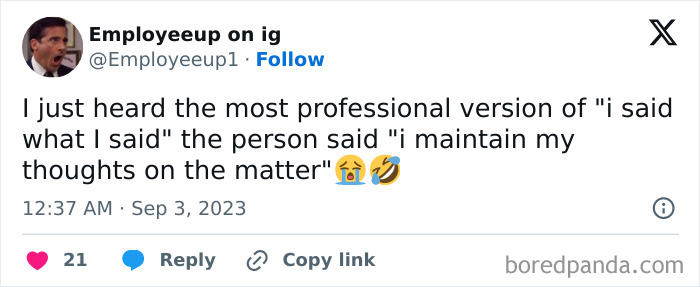Ah, another exciting day in the corporate world! I’m sure you live for waking up at 7 a.m., drinking mediocre office coffee and engaging in small talk with colleagues whose names you don’t know. And lucky for you, you get to do it all again tomorrow! If you’re a cog in the corporate machine, you know all too well what it’s like to spend your days sitting at a desk and reading cringey posts on LinkedIn. And if you’re interested in checking out some hilarious memes about this experience, you’ve come to the right place! Below, you’ll find some of our favorite posts from the Surfing Corporate Instagram account. So enjoy scrolling through them while pretending to work, and keep reading to find conversations with the creator of Surfing Corporate, Aileen Merciel, and Ellen Venkrbcova, Marketing Manager at Femme Palette! More info: Website | Podcast “The original idea began in 2017 after I had just undergone a life-threatening surgery due to intense work-related stress,” the creator shared. “I was forced to press pause and ask myself some hard questions: ‘Why did I allow work to jeopardize my physical and mental health? Why didn’t I set boundaries? Why hadn’t I been able to handle the stress better?’” “My way to process this was writing about it through a humorous lens, my go-to coping mechanism,” Aileen explained. “I started jotting down some of my ‘corporate wisdom’ tidbits here and there, then I started diving deeper into broader topics about corporate life and writing personal stories of my most embarrassing moments at work.” “Social media was not my thing, and I didn’t have the faintest idea of how to build a brand or community, but since I had already invested so much time in the Surfing Corporate idea, I decided to give it a try,” the creator continued. “I never expected the Instagram account to take off like it eventually did, or the subsequent podcast I co-host with Glenda Pacanins (my former colleague), which was nominated for a 2024 Ambie Award!” “You’re in a constant competition, and that leads to people being guarded at all times, in offense mode, and taking themselves way too seriously. In many corporate settings, politics and optics are more important than the work itself, which is exhausting for people like me who don’t have a ‘Succession’ or ‘Game of Thrones’ mentality,” Aileen added. “I’ve also been part of companies driven by personal agendas, which is very hard to navigate,” the creator added. “Of course, there are always going to be coworkers and bosses you don’t vibe with, or politics you don’t agree with. Learning to navigate tricky, uncomfortable situations and challenging personalities is a skill you can apply to all types of scenarios, not just work.” Next, Aileen recommends making sure you find your tribe. “For me, that was people with a sense of humor who didn’t take themselves too seriously. I would seek opportunities to make a random weird observation or a joke just to see who would smile back, who would give me a judgmental side glance, and who didn’t get it at all,” she explained. “Finding your tribe is essential for building support and camaraderie at work, and I’ve made incredible friends this way.” “Corporate life can be soul-crushing, so it’s up to you to decide how you’re going to face hard times or handle challenging people. You can choose to escalate something with an insult, or de-escalate it with a joke. Getting a group of people to laugh during a tense work meeting is a great high for me,” the creator shared. And if you’d like to hear more wise words about navigating the corporate world, be sure to check out Surfing Corporate’s blog! “As women, we can feel apprehensive in these areas for fear of being labeled as ‘pushy’ or ‘aggressive,’ but if you want to grow in a corporation, you can’t afford to blend with the crowd. Find your strengths and put them forward confidently,” she noted. “One thing I’d advise though is always tapping into your emotional intelligence and being empathetic,” the expert added. “An inappropriate joke can be hurtful, embarrassing, and ultimately even damaging to team dynamics.” And if you’d like to hear more wise words about career growth from Femme Palette, be sure to visit their website, LinkedIn or Instagram! Follow Bored Panda on Google News! Follow us on Flipboard.com/@boredpanda! Please use high-res photos without watermarks Ooops! Your image is too large, maximum file size is 8 MB.