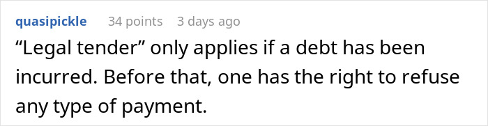 The person saw that the man had smaller bills, so they asked him to pay with something else, but the man started talking about the employee’s legal obligation to break his $100