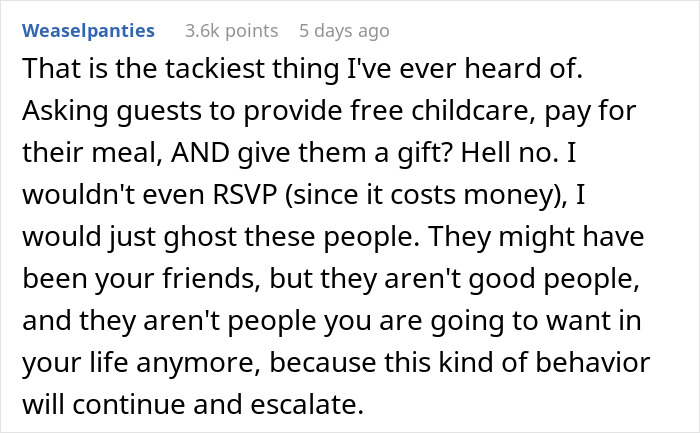 Share icon Image credits: EdenCapwell We got in touch with EdenCapwell and she said she had always loved the bride. “I was there when she was born. My husband and I helped her get her first car and paid her phone and insurance in college so she wouldn’t need a part-time job,” the Redditor told Bored Panda. “She was truly like a goddaughter to us. And the groom is related to us via marriage — the bride and groom met at a cookout at our house a year ago.” However, the author of the post believes the couple should have behaved better with other guests too. “I think asking anyone to pay for a meal is just too much. I’ve been to weddings that have a basket set out for monetary contributions for the honeymoon but not the meal you’re served. And being told that I was going to babysit without being asked was just so rude to me. It’s rude. I thought we were a chosen family.” Share icon Image credits: seventyfourimages/Envato elements (not the actual photo) We might assume that stories about ridiculous weddings are anomalies. However, some online discussions suggest that cringe is a somewhat common companion of these events. “Weddings are still a significant life event or rite of passage for many women, and as such, they can become fixated on creating the ‘perfect’ event in anticipation that it will be ‘the best day’ of their lives. This can cause a lot of stress,” integrative psychotherapist and couples counselor Hilda Burke explained. Burke believes that the increasingly bigger financial demands of a wedding almost certainly contribute to the emotional pressure cooker — spending $33,000 on 10 hours of your life can definitely prompt a few irrational decisions. Still, couples should strive to make sure their guests are comfortable and have a fabulous time at their wedding. Otherwise, why bother inviting people you do not want to be with you in the first place? How they treat their wedding guests in the lead-up to their wedding sets the tone for what’s to come and can have just as much of an impact on the guests’ enjoyment as the big day itself. Share icon Image credits: Craig Adderley/Pexels (not the actual photo)