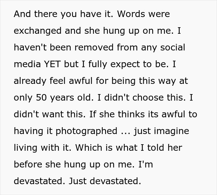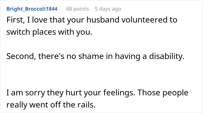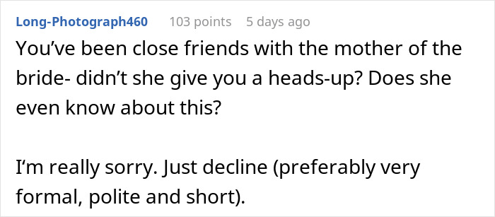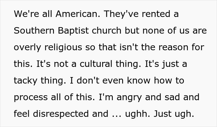 According to Dominick Evans, a filmmaker and activist who works for the Center for Disability Rights, similar situations are more common than one might think. Evans says that the consequences of such exclusions can diminish the person’s self-esteem and can even lead to internalized ableism as well as the spread of the belief that a disabled individual is a burden to family and friends, even if these guests aren’t. “It is a horrible misconception that those of us with disabilities are jealous when we see others doing something it is assumed we cannot do. Really, most of us find another way to do things, even with a disability,” he explained. In an ideal world, the couple will proactively provide everything the guests might need to enjoy their ceremony. But this time, it wasn’t the case. “I would have been super upset not to be invited to the ceremony, but I think it would have hurt less than this,” EdenCapwell added. “If they had told me there were limits on the attendees and they had to cut the guest list … I could have accepted that. But again … I’ve always been told I’m family to them and I’ve always treated them like family. So this is just devastating for me. And if they couldn’t afford to feed the 200 plus guests they invited, I think all of us would be okay with smaller portions or not having an elaborate meal just to be part of their special day.” Sadly, the woman just feels like a lifelong friendship has ended. “I’m mourning this whole family as if they’ve died and my heart is shattered.” Anyone can write on Bored Panda. Start writing! Follow Bored Panda on Google News! Follow us on Flipboard.com/@boredpanda!