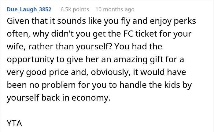 If that sounds difficult, well, it is! That’s why having someone to share the responsibilities with can make a world of difference in ensuring a smoother and more enjoyable flight for everyone on board. Father and Reddit user Fit-Kangaroo585 should have known this—after all, he and his wife have three kids. However, during their recent family vacation, he got a chance to upgrade to first class for a fraction of the usual cost and left his partner to manage the little ones alone in economy, something the woman was very unhappy with.