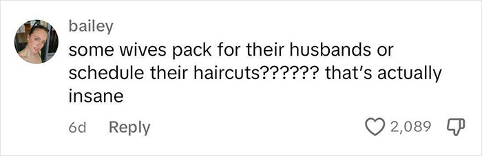 The woman shares all the things she doesn’t do for her husband: “I don’t buy him new underwear when it’s got holes in it”