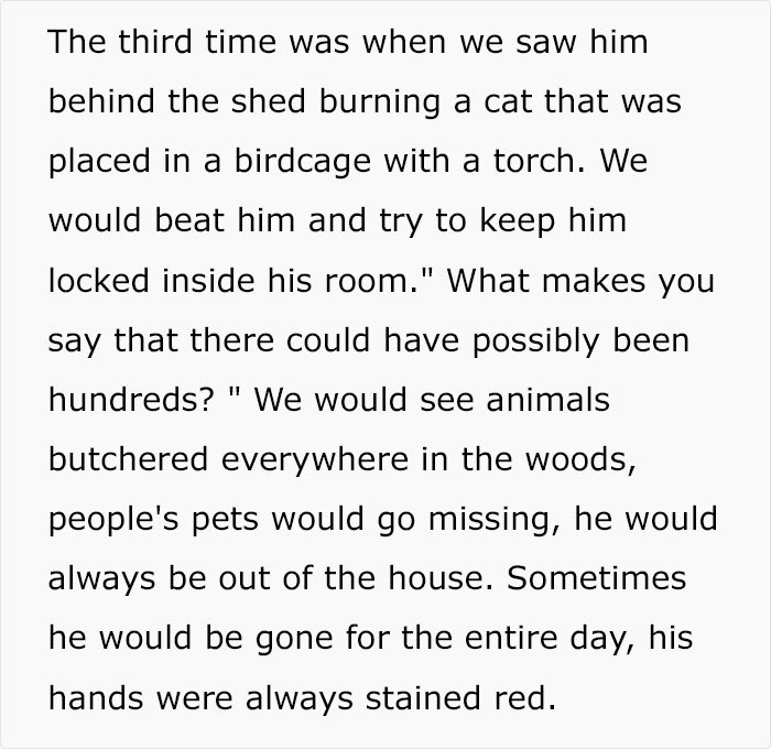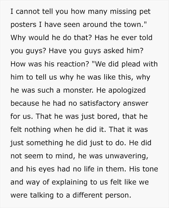 Share icon Share icon Share icon Share icon Share icon Share icon Image credits: Mia X (not the actual photo) Share icon Share icon Image credits: dawg-208 The story is extensive and detailed (and PG, fair warning), so our coverage will focus on the internet’s reaction across the posts and other relevant information. In total, there have been 4 posts made on the topic—the original post, a post following up with added info in response to the questions in the comments, as well as update number one and number two. Combined, all of them accrued a couple thousand upvotes with several thousands of comments. Speaking of which, the overall consensus among people in the comments was “run”. Considering what has happened, people were convinced that this isn’t the last as it’s giving off strong danger energy—so strong, many suggested this was the first step in serial killing. One commenter gave a detailed take on the whole situation, explaining that the biggest red flag here is that the guy wasn’t the one revealing this—the parents were. Another point they made was that even if someone loves animals, it doesn’t mean they won’t hurt them as folks can have violent and unhealthy tendencies that form from obsessions. In any case, it was suggested to stay safe. There were folks who thought this whole shtick is fake—there’s always a non-zero chance of that being the case with Reddit posts. However, that doesn’t mean that warnings shouldn’t be thrown out there and heeded in the off chance that it’s actually true. Still, if you want to hear the reasoning for this, this commenter has it. Whatever the case, some did question why the guy hasn’t been reported to the police yet, let alone how OP is more or less ethically and morally obligated to let the shelter know of the situation. If anything, contacting the police would help ensure OP’s safety.