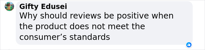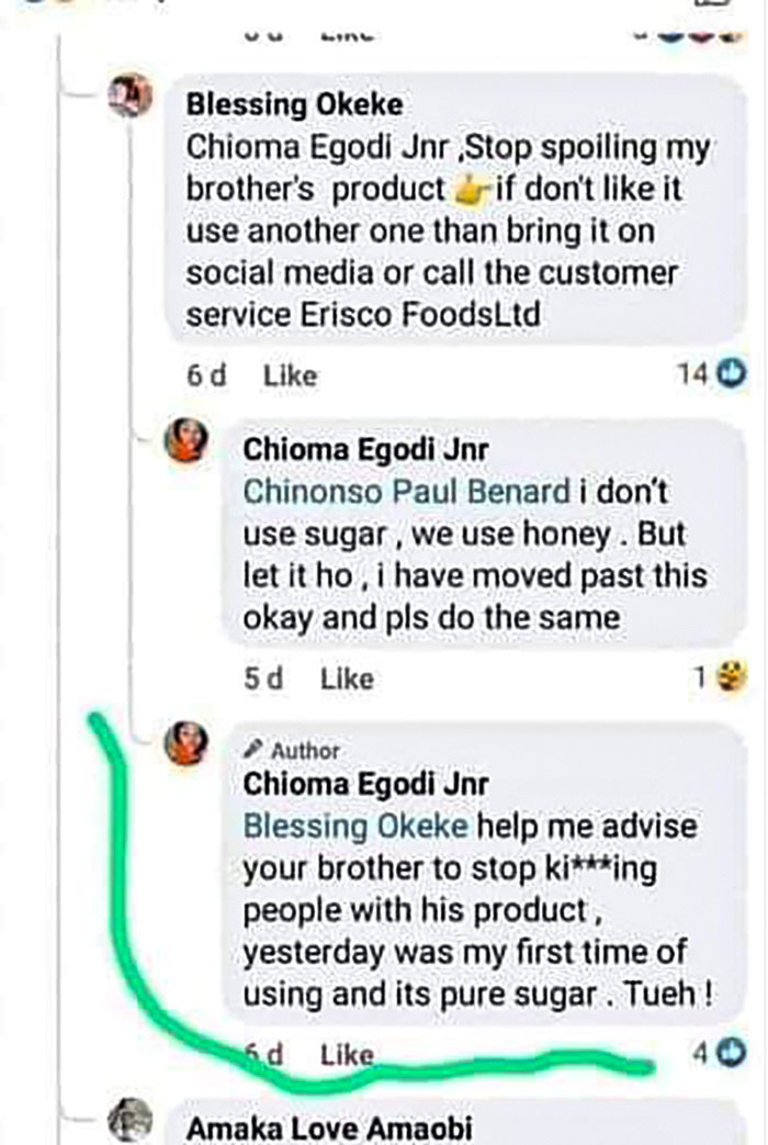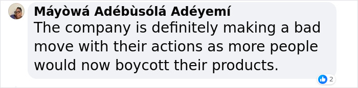 Okoli received a comment that was seemingly written by a relative of the food company’s founder