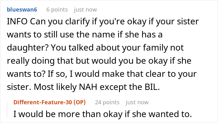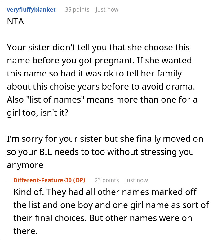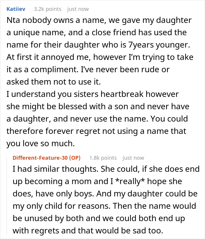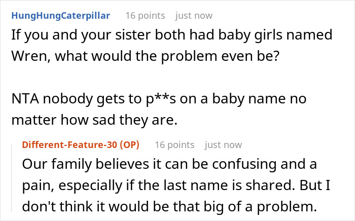 No, it’s actually quite simple – the Original Poster (OP) is pregnant with her first child, a girl, and she and her husband have already chosen a name for her – Wren. The choice of name was completely unanimous, and over the past couple of months the spouses have already become close to it. Well, you probably know how it happens. When the baby hasn’t yet been born, but you associate them exclusively with the future name. Moreover, the parents-to-be have already bought a lot of kid stuff with this name. And so, they recently announced to relatives what the baby would be called – and the author’s big sister looked clearly upset. The thing is that she and her husband have been trying unsuccessfully to conceive a child for many years. Recently, the couple underwent some special procedures to increase fertility – and now they are desperately hoping to have a baby soon. And, as it turned out, the favorite female name for both of them is Wren too! So the sister literally begged the OP to give up this name in favor of her not yet conceived, but probable, daughter. However, to no avail. Our heroine consulted with her husband and said that they weren’t ready to give up the name they already love so much. The sister was even more upset, but found the strength to admit that she understood the OP well. However, after some time, the author’s BIL made another (fruitless) attempt to сoax her somehow. But all he achieved was some doubt in the woman’s head. Which she tried to dispel by simply asking people online for advice. Share icon Image credits: Neal E. Johnson (not the actual photo) “It’s a complicated situation, really complicated. On the one hand, you can perfectly understand an older sister who wants to become a mother so much. On the other hand, here we have a real child who will be born in a few months – and depriving her of her chosen name over a hope is also wrong,” says Irina Matveeva, a psychologist and certified NLP specialist, with whom Bored Panda got in touch for a comment here. “In my opinion, this woman did the right thing – she insisted on her own, but did it as correctly as possible in relation to her sister. Apparently, the sisters have always been on good terms, so the reaction of both women here is respectful and pretty calm. I must say, this doesn’t always happen. In any case, I do hope that the older sister will also become a mom soon – and will choose another, no less beautiful, name for her daughter. Or there will be two namesake cousins, why not?” Irina wonders. By the way, commenters also asked the original poster what the problem was in naming both girls the same. According to the OP herself, this has never happened in their family, and they honor traditions. On the other hand, sooner or later any tradition can fall… Be that as it may, people are sincerely glad that the sisters didn’t make any drama about this. “It’s a tough situation and I’m glad you and sis can speak about it openly,” one of the commenters wrote. In the end, no matter how harsh it may sound, but dreams are dreams, and real life is here and now. “I sympathize but a real baby takes precedent over an idea that may never come to fruition,” another commenter concluded. “That’s hard to hear. But at the end of the day, it’s your child. Name it what you want.” By the way, disputes over names for an unborn baby don’t always end this way – just after they began. It’s enough to read at least this post of ours, where a future parent’s relative subjected the name they chose to merciless criticism. And without even explaining her reasons. If you also have a similar story, please feel free to share it here – in the comments section below the post.