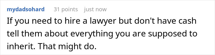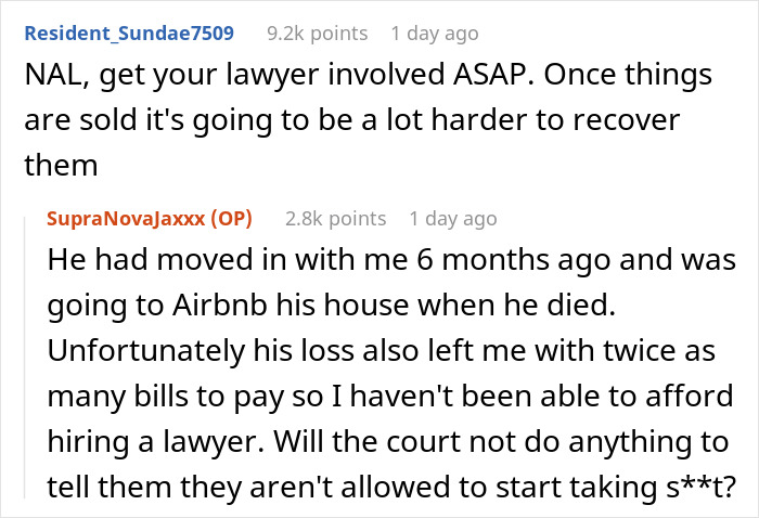 The woman begins her story by telling the community that her boyfriend died unexpectedly a couple of months back. She adds that he left a will stating that she and her son were to inherit his entire estate, including his house, 5 cars, and 2 motorcycles, among other things. Apparently, her boyfriend didn’t have a relationship with his parents due to an abusive childhood, but the parents don’t believe he had a will and feel entitled to everything. They’ve since come round to the house and removed all the vehicles for storage at their house, even though a court clerk verified that the will is legal and valid. To make matters worse, they’ve taken their dead son’s laptop and used his Facebook account to start selling off his smaller possessions like furniture and the like. OP says she thought it was illegal to touch or remove anything until someone has been assigned to inherit the estate but reached out to Reddit to find out what her legal options are. In the comments below her original post, OP mentions that she’s now paying double bills, which means she can’t afford a lawyer at the moment. Still, without the intervention of the courts, there’s not much she can do about the family’s atrocious behavior. Share icon Image credits: Sora Shimazaki / pexels (not the actual photo) According to USLegal, most lawyers charge between $100 and $300 an hour. This can be prohibitive if you don’t have a lot of cash to spare and need a lawyer to get you out of a legal jam or protect your assets. Depending on your situation, you can use a variety of strategies to get free legal advice or low-cost legal assistance. These include contacting the city courthouse, seeking out free lawyer consultations, contacting your county or state bar association, or even visiting a law school. You could also choose to represent yourself. According to the American Bar Association, OP could also resort to legal aid, pro bono programs, and free legal answers, an online pro bono program that matches low-income clients with volunteer lawyers, who agree to provide brief answers online for free. After speaking with an attorney or law student, you might decide that you need a lawyer – and you may find one who will work with a relatively small budget. Also, many attorneys offer payment plans that let you pay monthly instead of in one large sum. Then again, you might find someone willing to take your case on contingency. That is, if you lose your case, you won’t pay. But if you win, the law firm will take a portion of the cash awarded to you. Hopefully OP can find some low-to-no cost legal help before it’s too late. Bored Panda reached out to OP to ask her a few questions about her terrible situation. When we asked her if she ever expected her post to get the attention it did, she had this to say, “I was very surprised to see my Reddit post received so much attention. My boyfriend’s family got wind of it and messaged me about it. I initially thought I had a snitch on my profile. However, one of my friends reached out to me and said they had seen me on the front page of Reddit. That is when I realized the amount of traffic it received. The online community is always willing to weigh in on someone else’s drama, however the people who made the effort to leave comments, especially those who contacted me to follow up and offer assistance, are greatly appreciated.” We asked OP what urged her to share her dilemma with the Reddit community and she said, “I’m new to Reddit and am still learning how the community works. The majority of my participation has been offering advice on certain subreddit topics that I’m familiar with. When I was uncertain about the legal circumstances of my situation, I figured there might be someone who had experienced similar circumstances. Reddit seemed the best place to seek advice.” When we asked OP if there’d been any updates on the situation, she told us, “I’m happy to share that I was granted full ownership of the estate on Friday. I immediately changed the locks on the property and took an inventory of everything missing. I will file a police report on Monday morning regarding everything that has been stolen.” OP concluded by saying that it was her hope that her Reddit post will inspire more people to make their own wills and put their final wishes in writing, no matter how old they are. Her boyfriend used a free online template, had two (non-beneficiary) friends sign as witnesses, and paid $10 to have it notarized at UPS. What do you think of the mess OP finds herself in? Can you believe the gall of the deceased man’s family? Let us know your opinion in the comments!