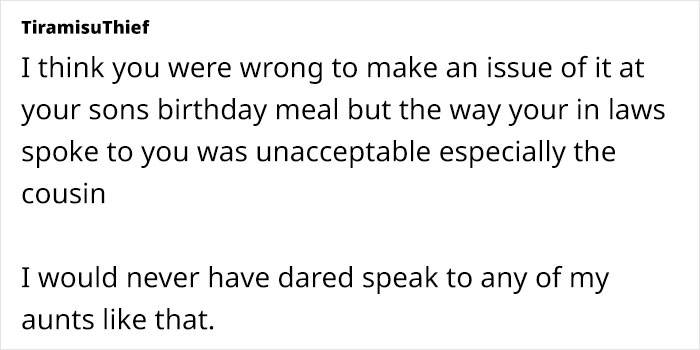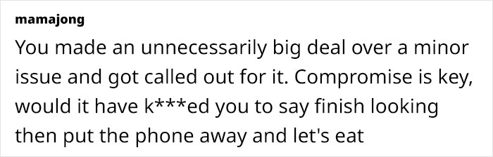 Like this mom, who threw a fit when her son’s cousin pointed out that her “no-phones at the table” rule was too extreme, while other relatives kind of backed him up. She vented about it online, and when netizens didn’t support her either, she was hurt and revealed that initially she’d hidden some details. More info: Mumsnet