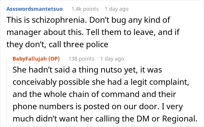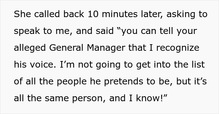 After stomping off, the woman called back accusing the general manager of pretending to be someone he wasn’t, which the night manager just thanked her for